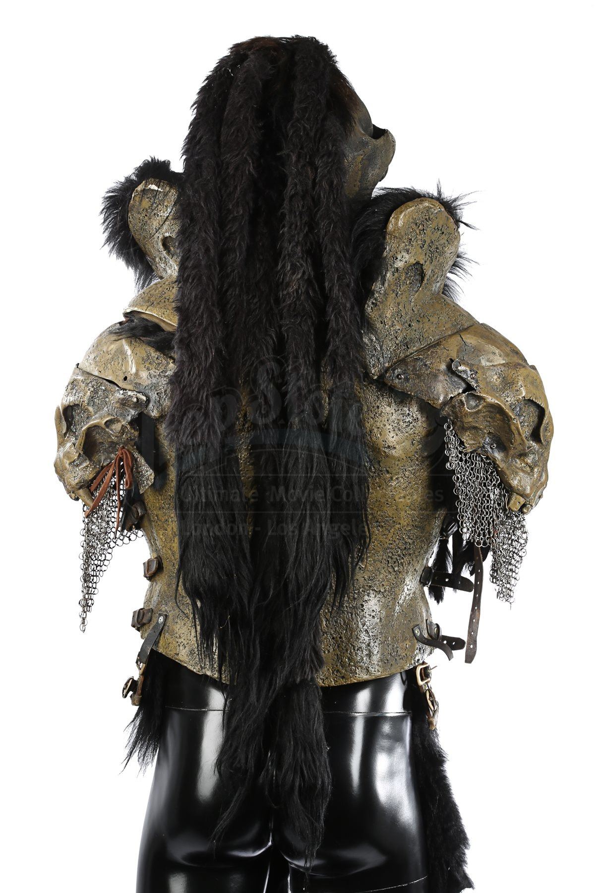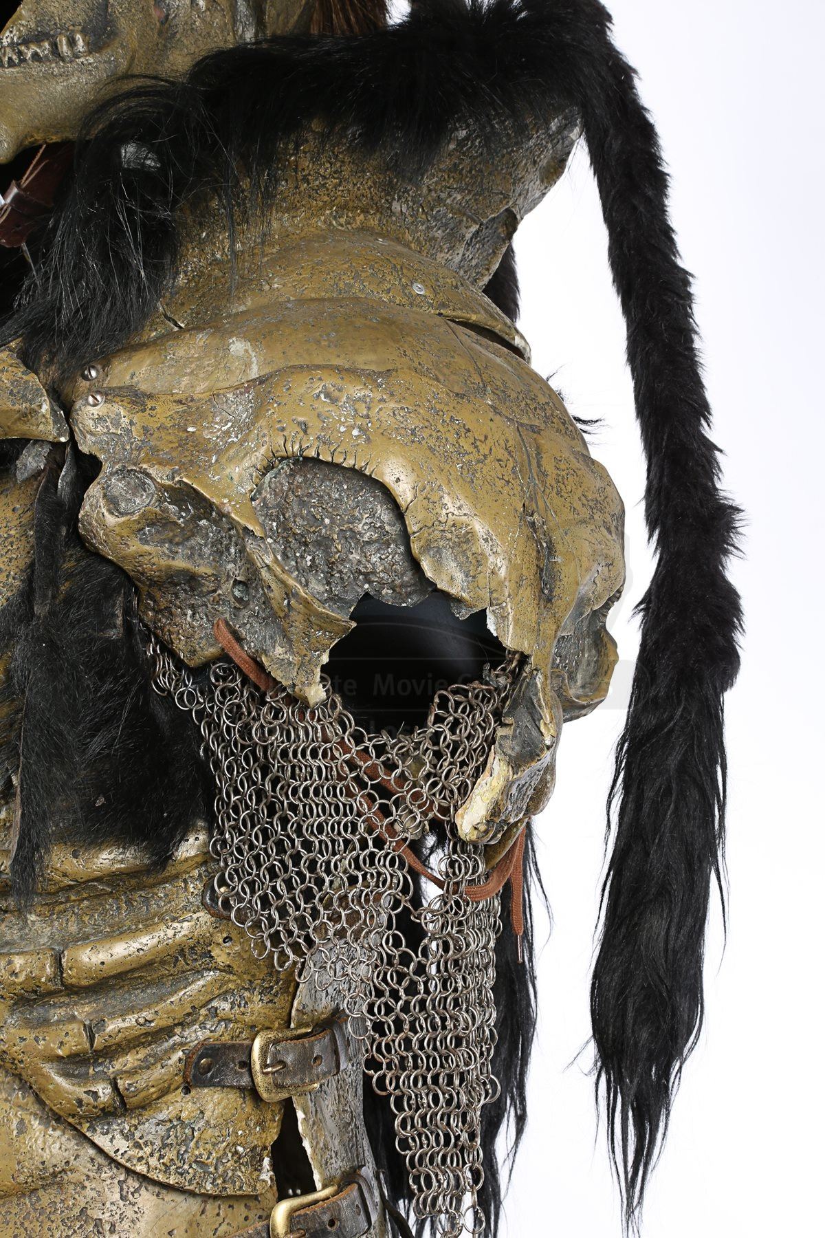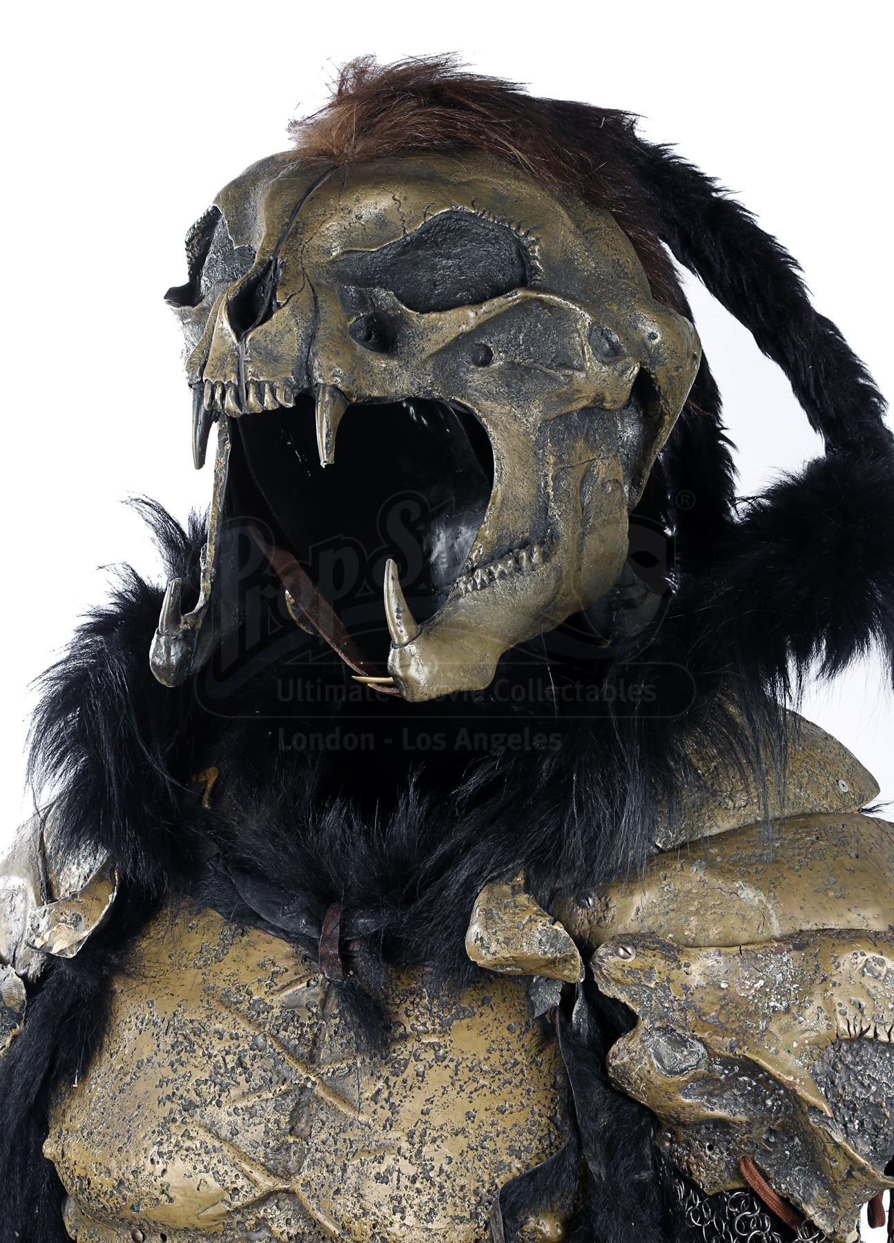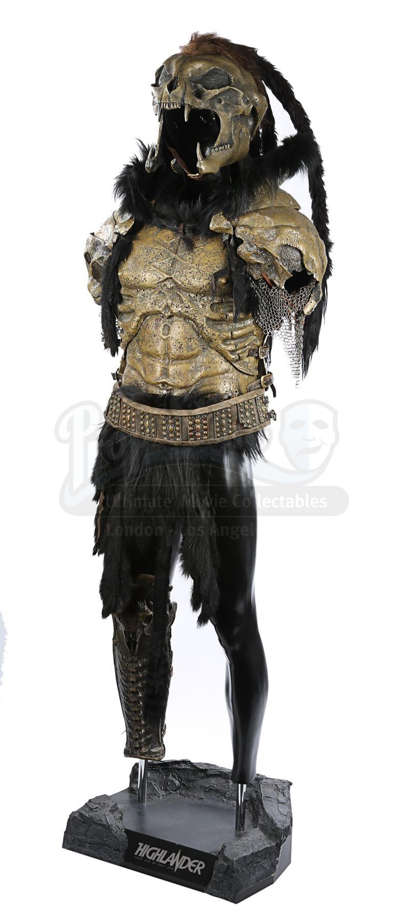 The costume consists of a cowl, body armour, shoulder guards and a single leg greave, with a leather belt and black faux-fur sporran. A replica helmet cast from the original production moulds completes the ensemble.