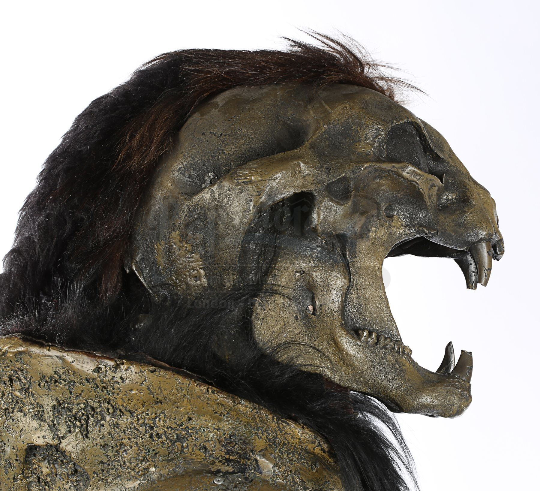 The helmet is a replica made from the original production mould. It features a brown-and-black faux-fur plume styled to match the sporran, and a buckled leather chinstrap. Each item has been distressed for production. The helmet’s long teeth are missing their sharp points, and the faux fur shows ageing and production-related wear. The costume is mounted on a custom mannequin display with a light-up base featuring the Highlander logo and artificial rock detail. Dimensions: 45 cm x 61 cm x 211 cm (17 ¾” x 24” x 83”)