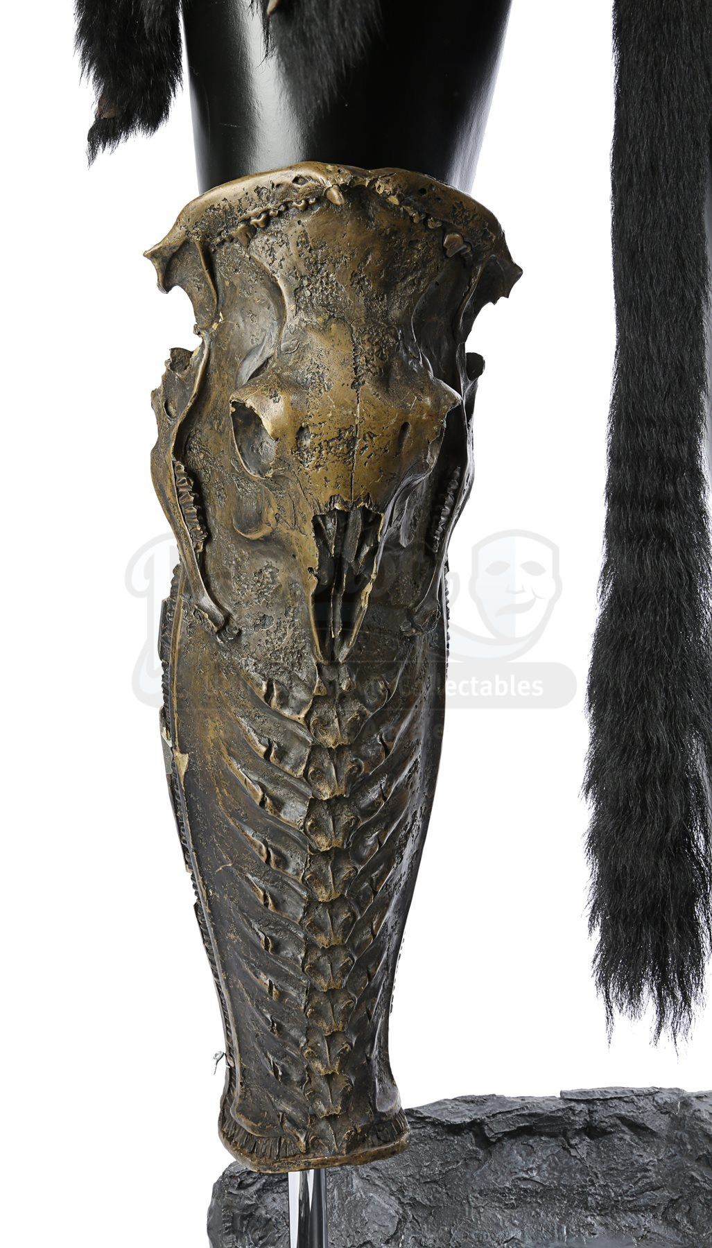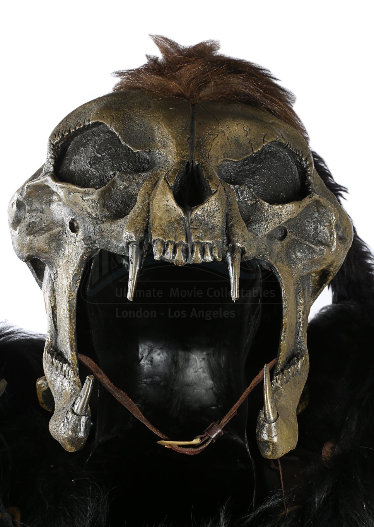 Each piece has been styled to resemble animal bones. Formed as a bony muscled torso, the body armour fastens with six brown leather straps and features a high cowl inlaid with black faux fur. Leather straps and strands of chain mail hang from each shoulder guard. Made to match the armour, the leg greave fastens with three leather straps. The leather belt is inlaid with plastic plates styled to look like metal, while the sporran features long, black faux-fur tails.